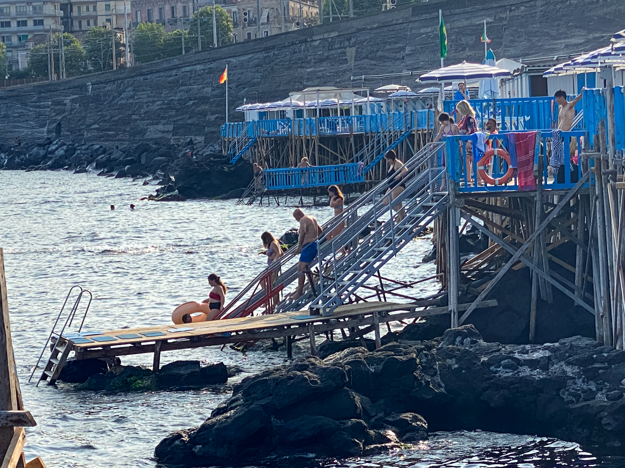 Unsere ganz besonderer Herzensplatz jedoch war das Lido Scogliera D’Armisi!!! Ohne unseren tollen Host Max wären wir da nie draufgekommen!!! Bei Aufenthalt Nr. 1 waren es bereits 38 Grad – bei Nr. 2 42 Grad!! Am Tag also nicht wirklich ein Klima für Stadtbesichtigungen, schon gar nicht für Ätna-Besteigungen. Dieses Lido = Badeanstalt ist vor über hundert Jahren erbaut worden (aber sehr gut in Schuss und gepflegt) und die Abkühl- & Relaxmöglichkeit der Catanesen. Wir haben tatsächlich kaum andere Touristen gesehen, lagen beim zweiten Besuch direkt neben dem Kellner des Restaurants vom Vorabend 😉