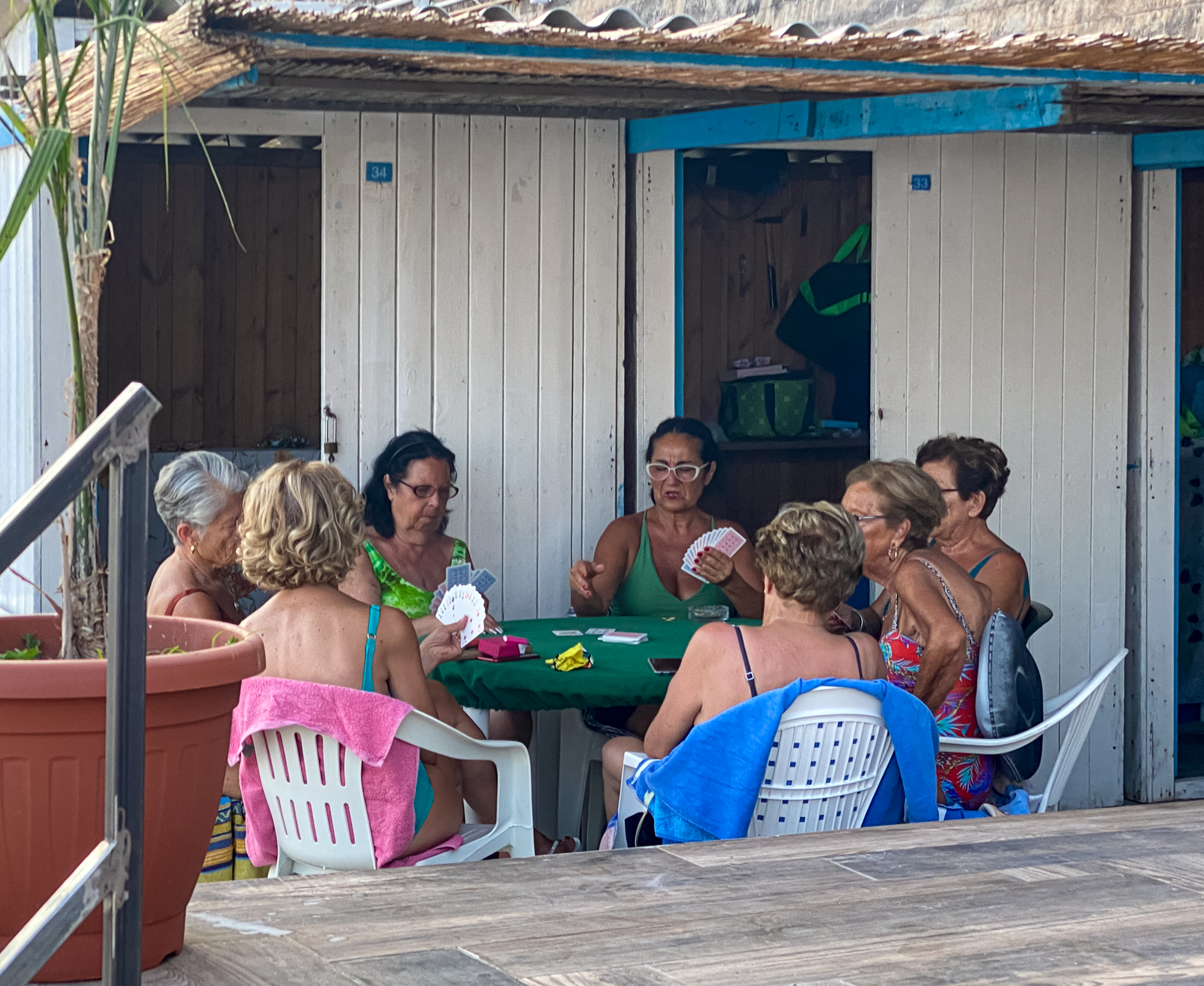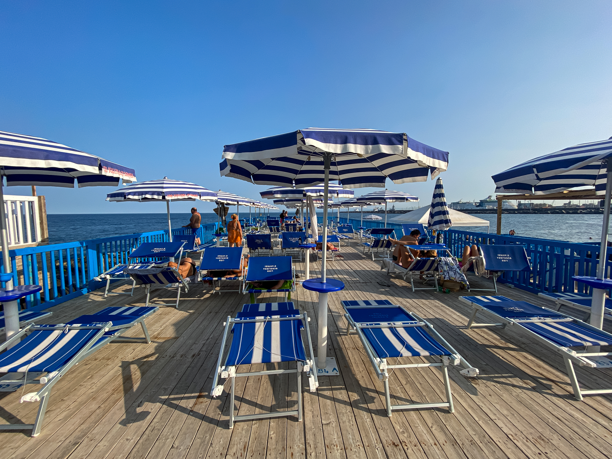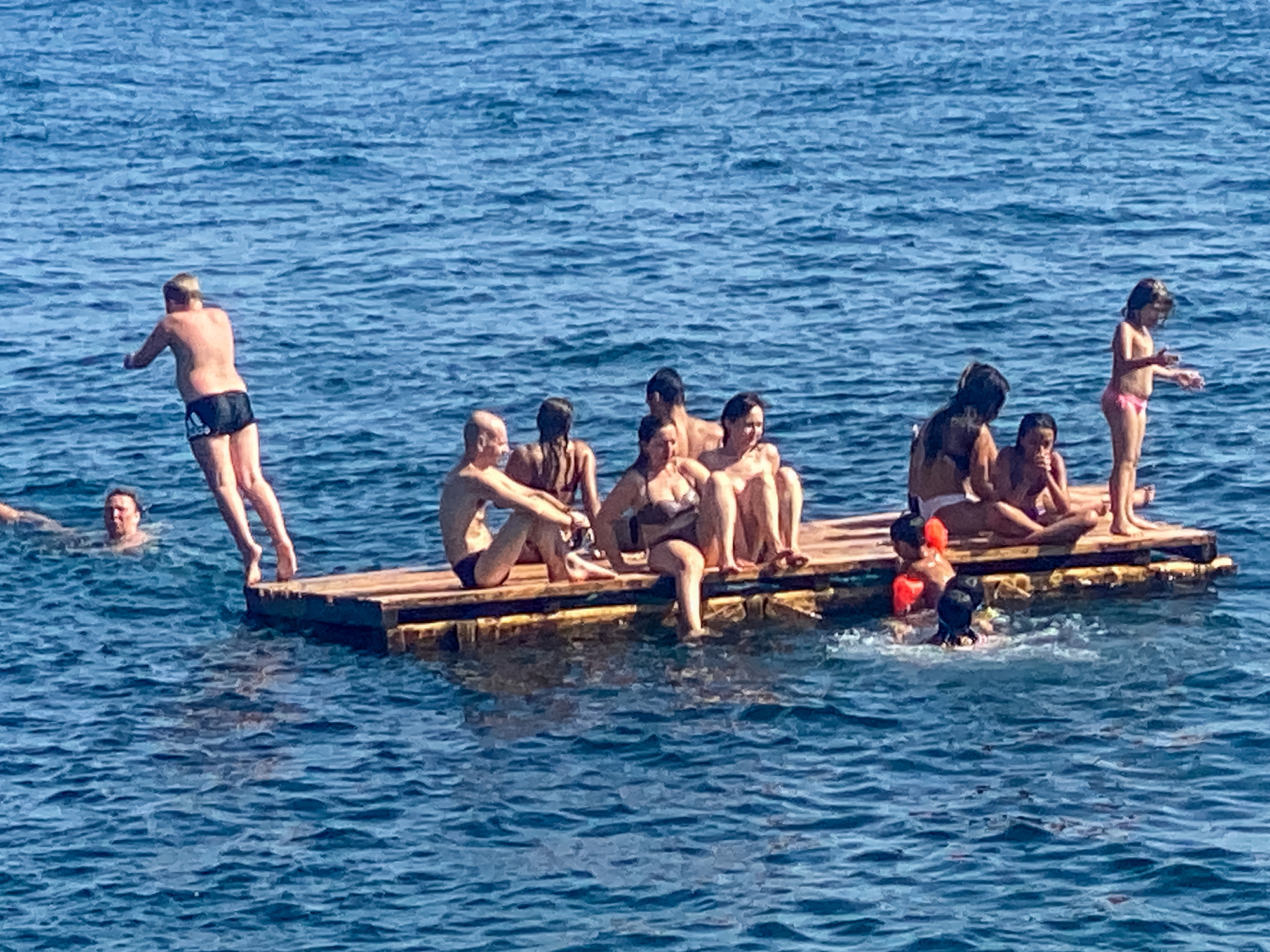 Die ganze Anstalt besteht aus großen Holzplattformen, die auf Stelzen auf die Felsenküste gebaut wurden. Viele Locals haben hier MINI-Hütten, vor denen sie sitzen, lautstark mit den NachbarInnen plauschen oder genauso temperamentvoll in (meistens) kleinen Seniorenkreisen Karten spielen – ein Schauspiel!! Der Rest kann sich Liegestühle und Sonnenschirme mieten, es gibt eine Bar, Duschen, eine Schwimminsel, … Ich freue mich einfach schon jetzt auf den nächsten Besuch, mich hier wieder unters Volk zu mischen und das Messina (= local Bier) zum Apero!!!
