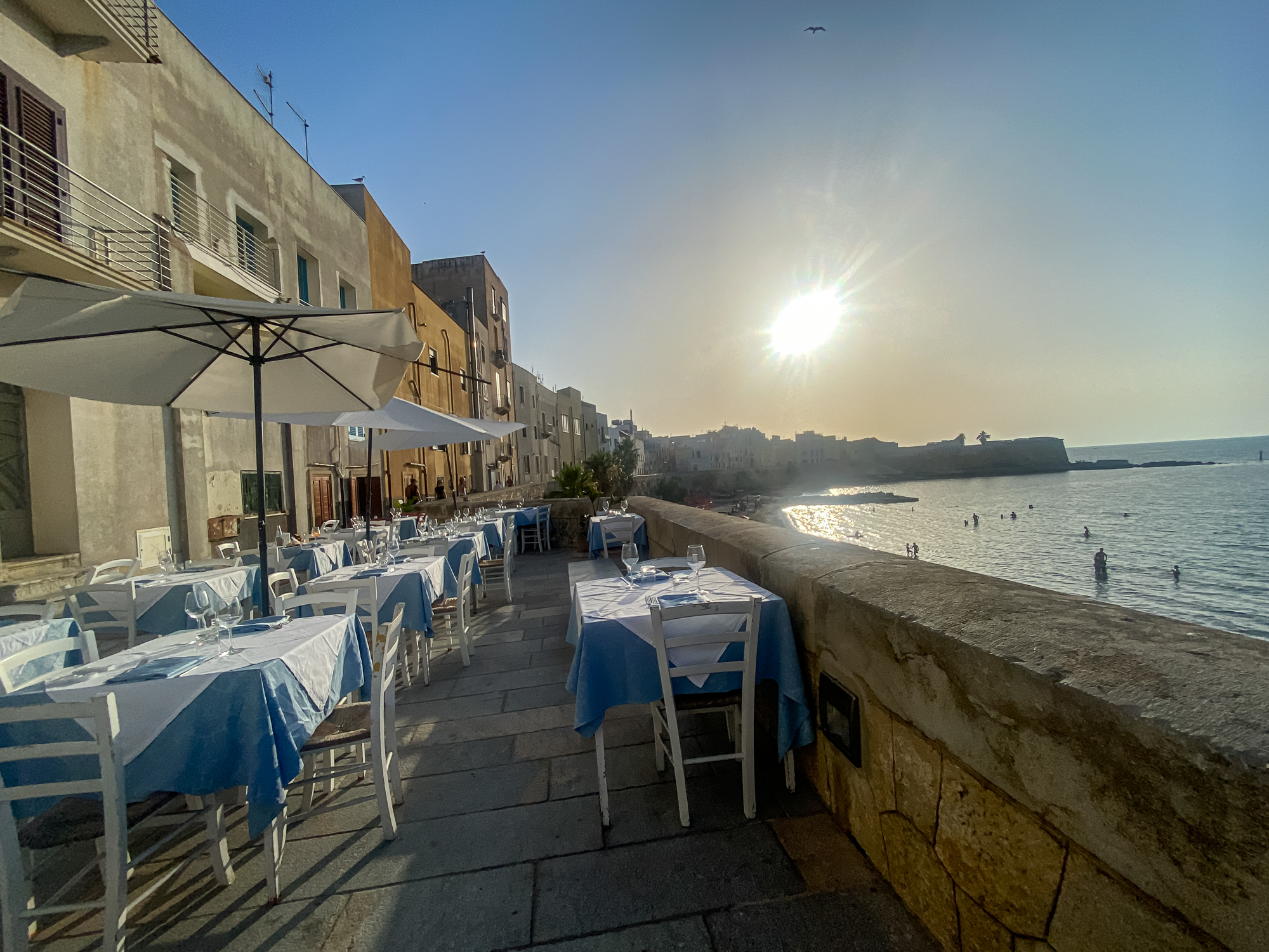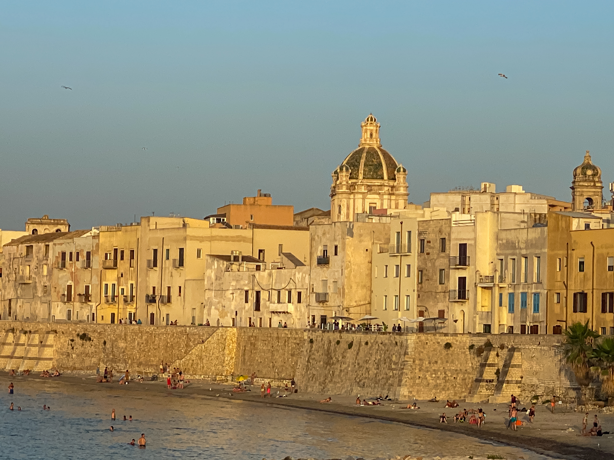 Trapani lieget im äußersten Westen auf einer weit ins Meer reichenden Landzunge. Hier treffen sich zwei Meere und zwar das Tyrrhenische & das Mittelmeer. Die Stadt hat es Jessika & mir neben Catania ganz besonders angetan, denn auch hier sind wir unterwegs mit vielen Einheimischen und nicht nur „unter Touristen“. Südlich der Stadt befinden sich noch jetzt Salinen, in denen seit Jahrhunderten Salz gewonnen wird. Es gibt viele schöne alte Gebäude. Wir haben uns treiben lassen und sind im Norden der Altstadt auf einen Weg unter der Stadtmauer gestoßen. So gelangten wir ganz unerwartet auf kleine Strandabschnitte – wo wir dann unseren auf der Reise fast täglichen Morning Swim hatten. I miss it!!! Wir haben uns dort in ein kleines Restaurant mit Bar direkt oben auf der Stadtmauer verliebt – Best Place für den Aperitivo. Have a look: Osteria Ossuna! Auch hier werdet ihr mich eines Tages wiederfinden (hier wurde auch mein Kopftuchfoto gemacht und ich denke, das „sagt“ alles über meinen State of Mind @Sicily/Trapani…)!